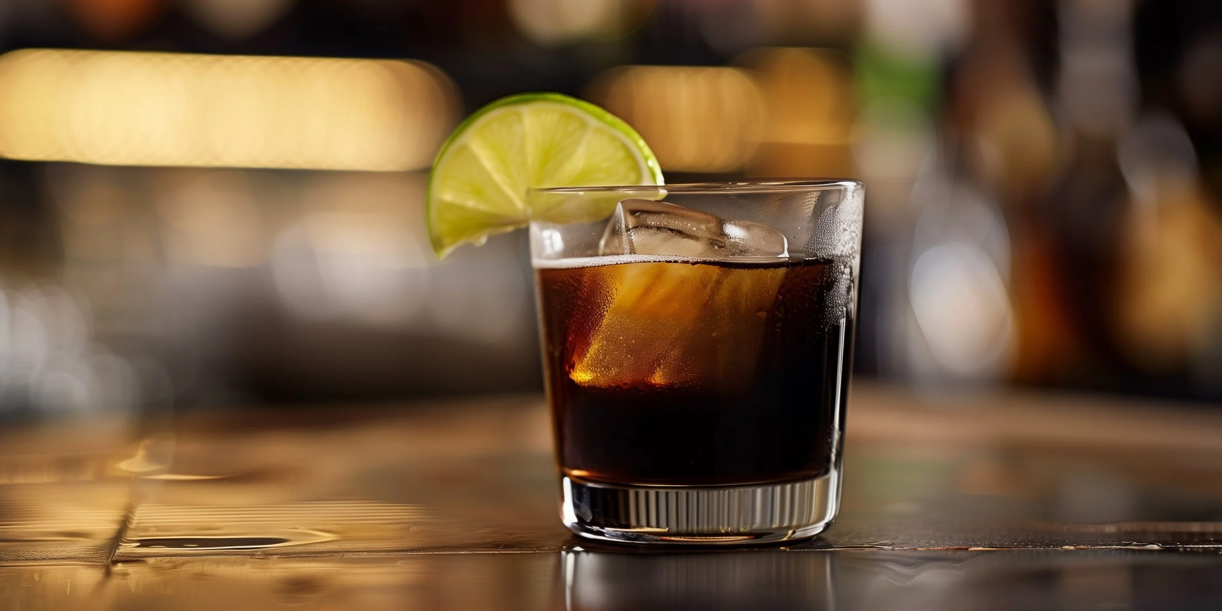 Captain Morgan rum with cola and lime juice, served over ice with a lime wedge