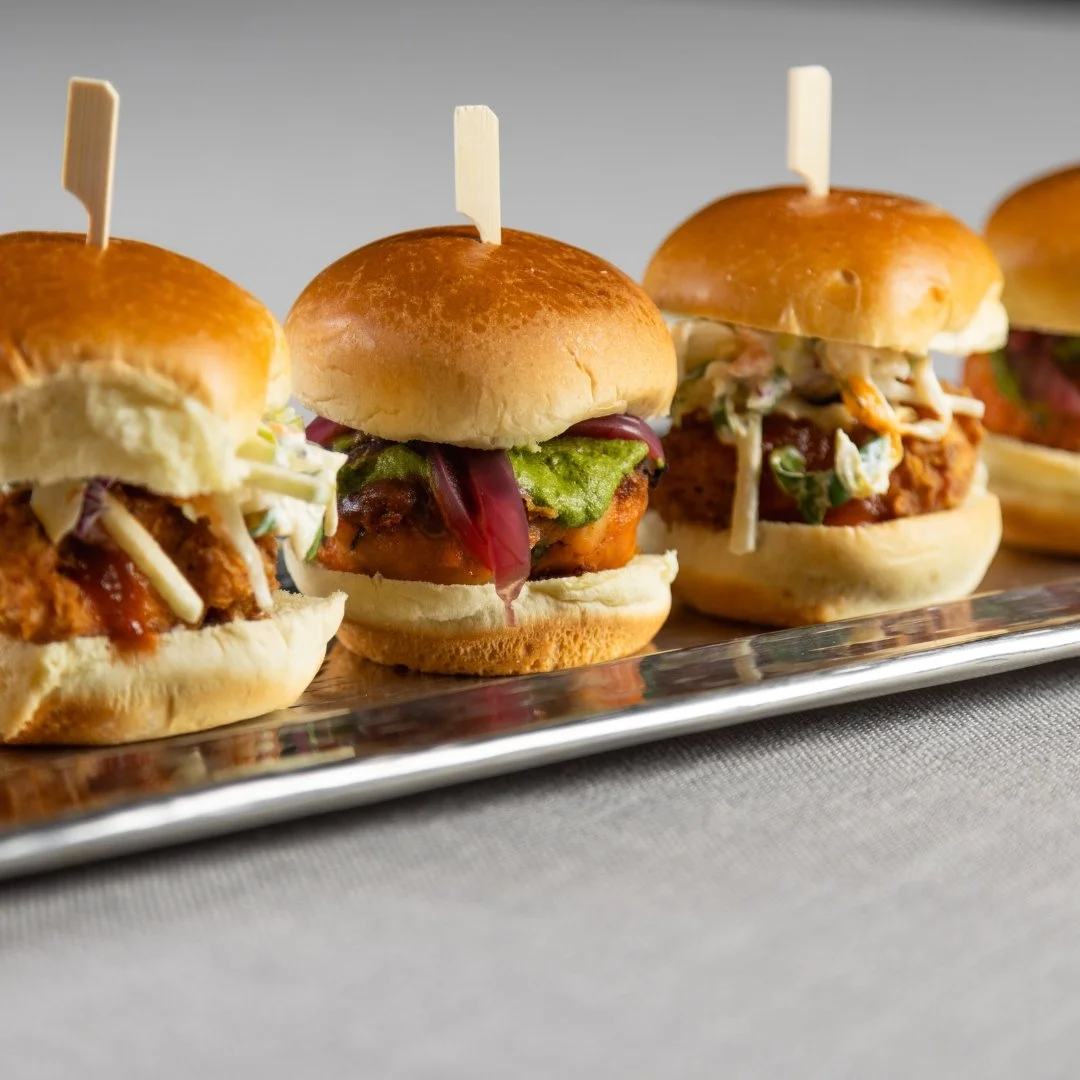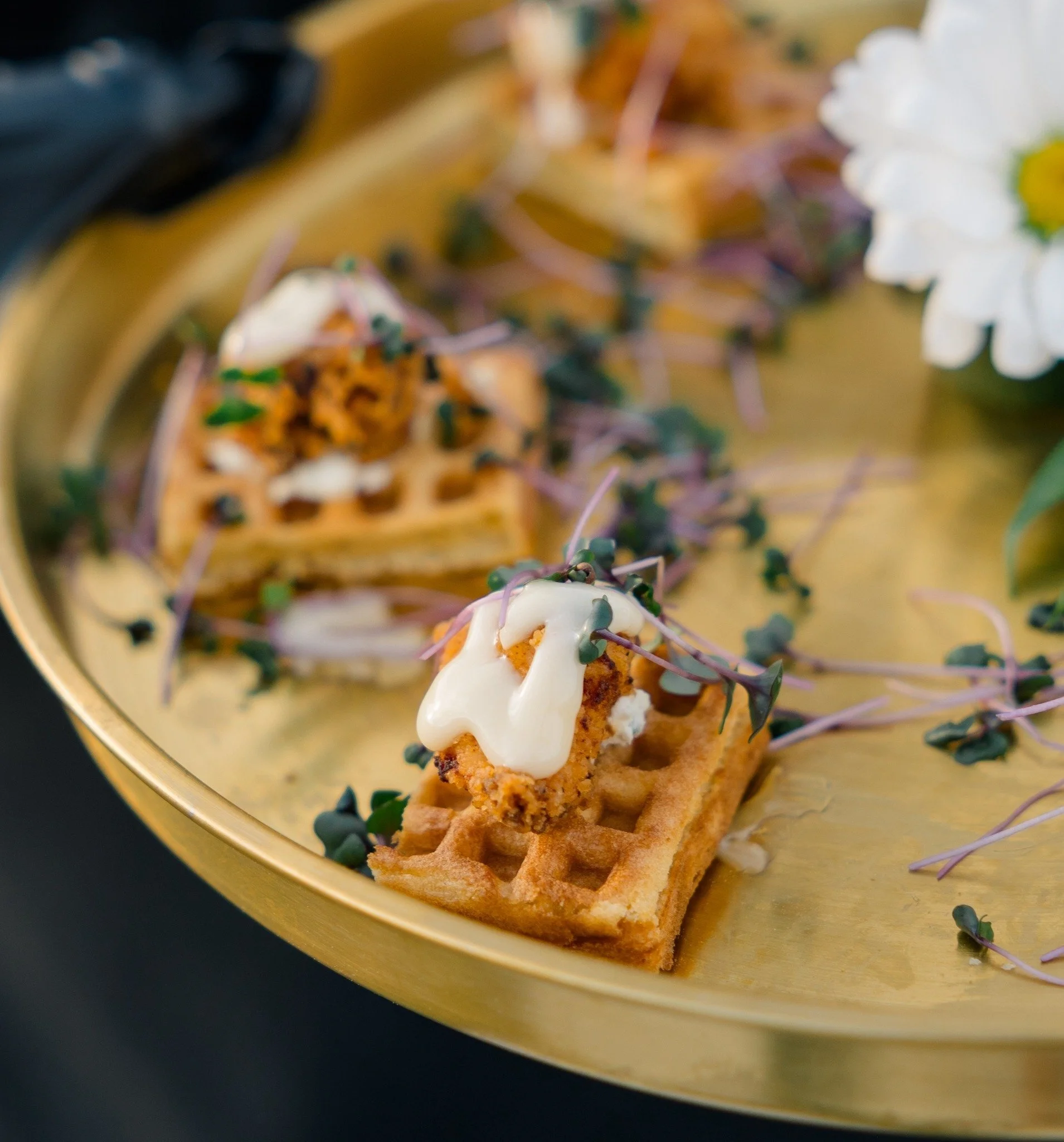 fried chicken on bite-sized waffles, with roasted leek goat cheese and honey aioli