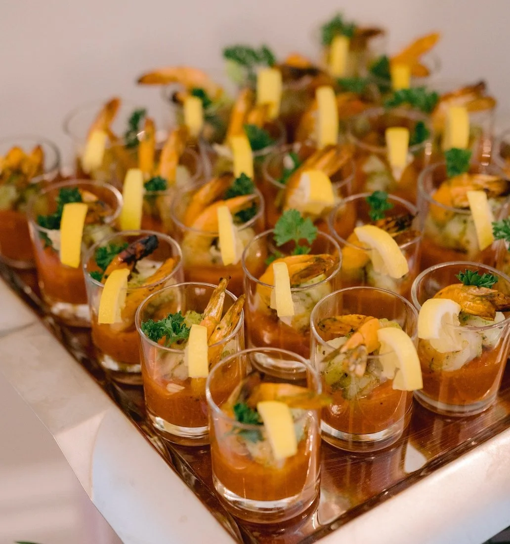 herb-grilled shrimp served cold with Bloody Mary cocktail sauce